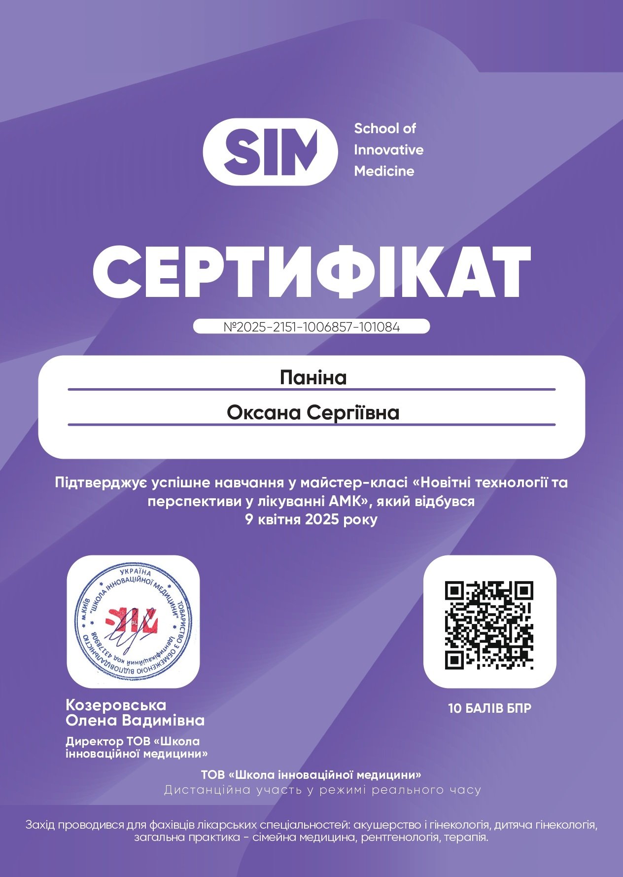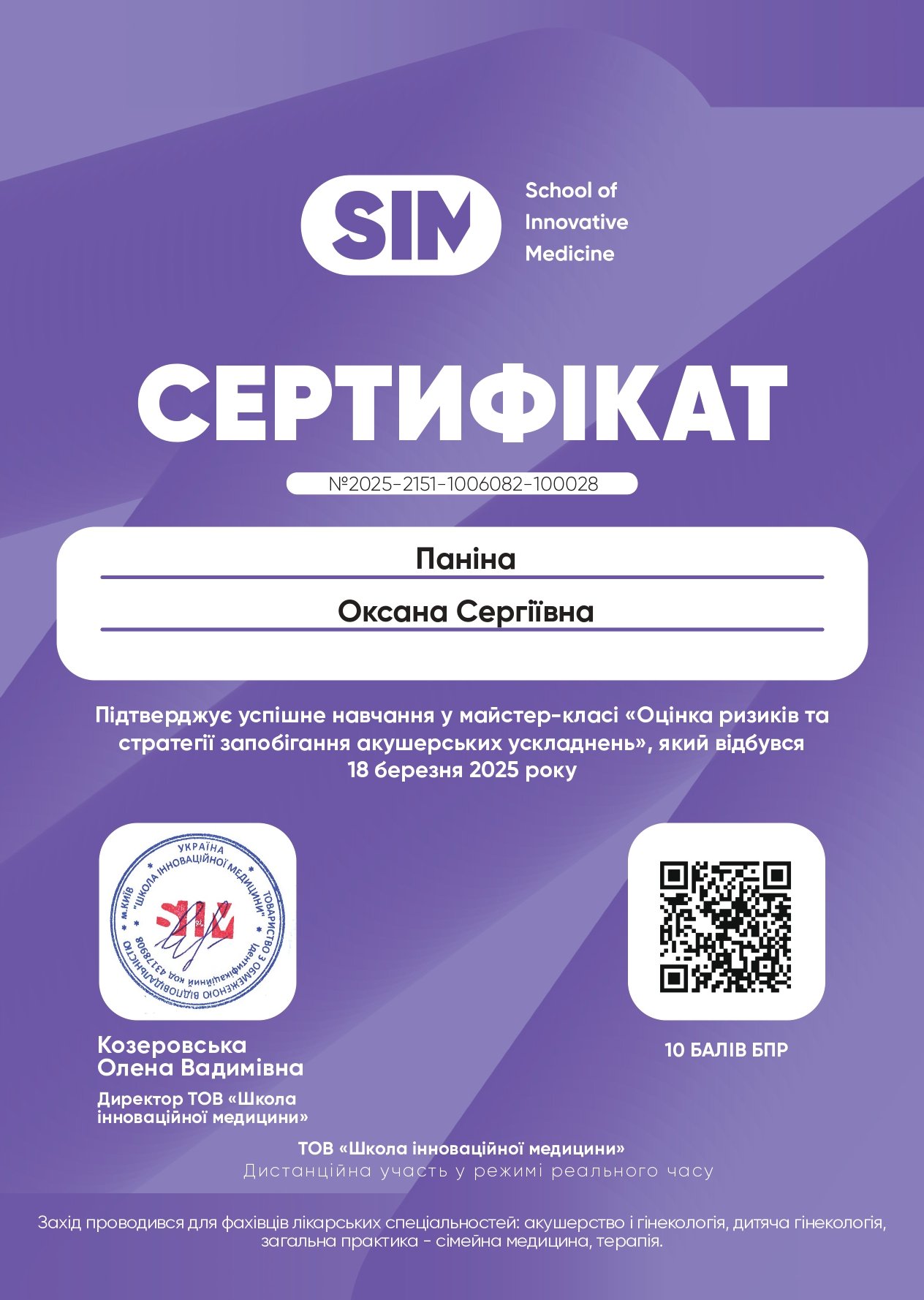 Август 2009г. - июнь 2012г. - Харьковская медицинская академия последипломного образования, специализация по «Акушерство и гинекология». С февраля 2020г. присвоена 1 квалификационная категория по специальности «Акушерство и гинекология».