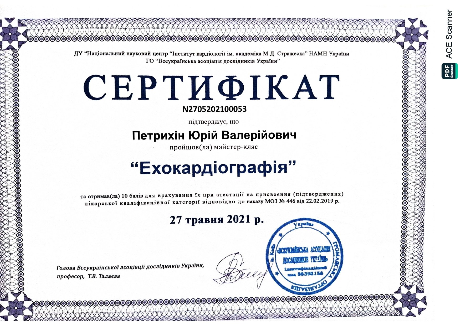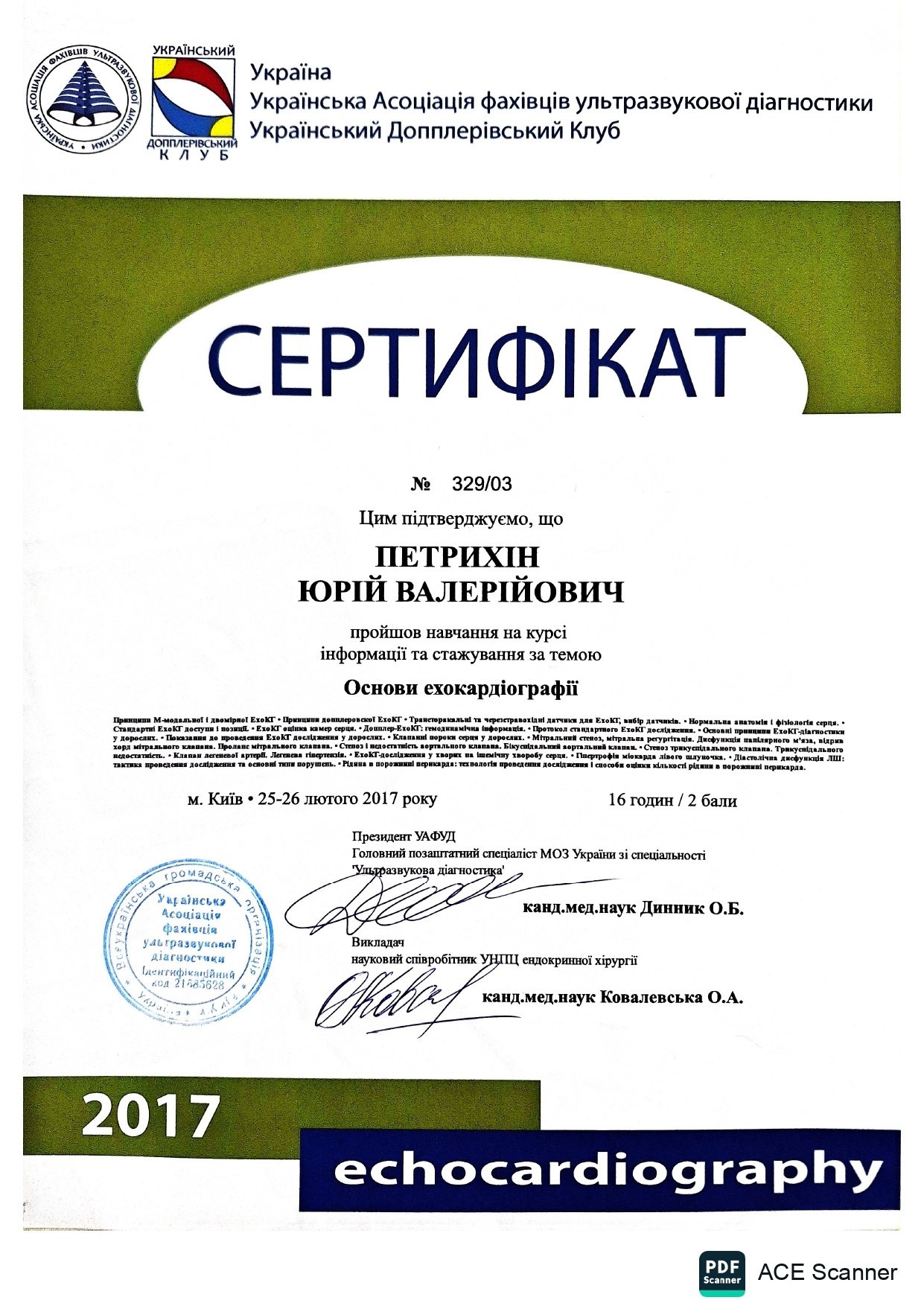 - 2017 г. - Украинский допплеровский клуб г. Киев – курсы информации и стажировки по теме «Основы эхокардиографии.