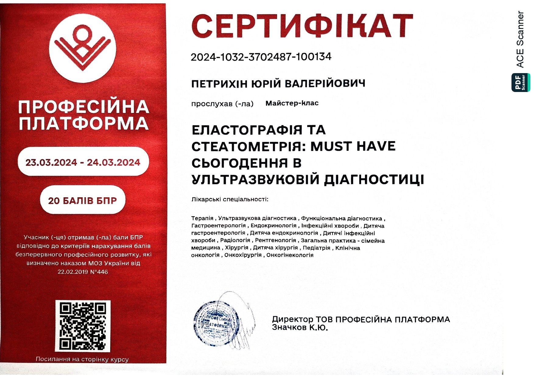 - 2024 г. – Прошел мастер-класс “Эластография и стеатометрия: Must have сегодня в ультразвуковой диагностике.