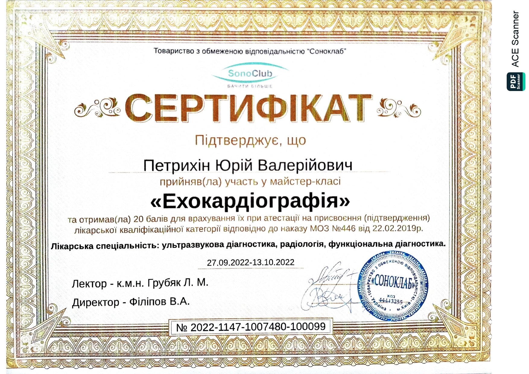 - 2013 г. - Украинский доплеровский клуб г. Киев. Курс информации и стажировки по теме «Основы допплерографии».