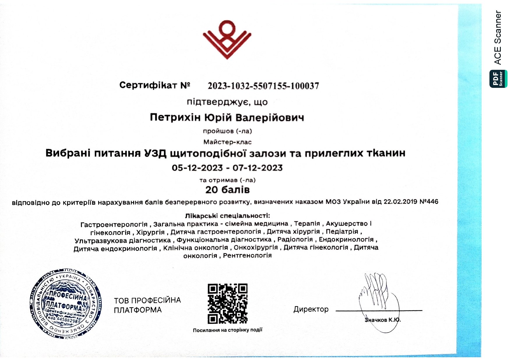 - 2023 г. - Прошел мастер-класс "Выбранные вопросы УЗИ щитовидной железы и близлежащих тканей".